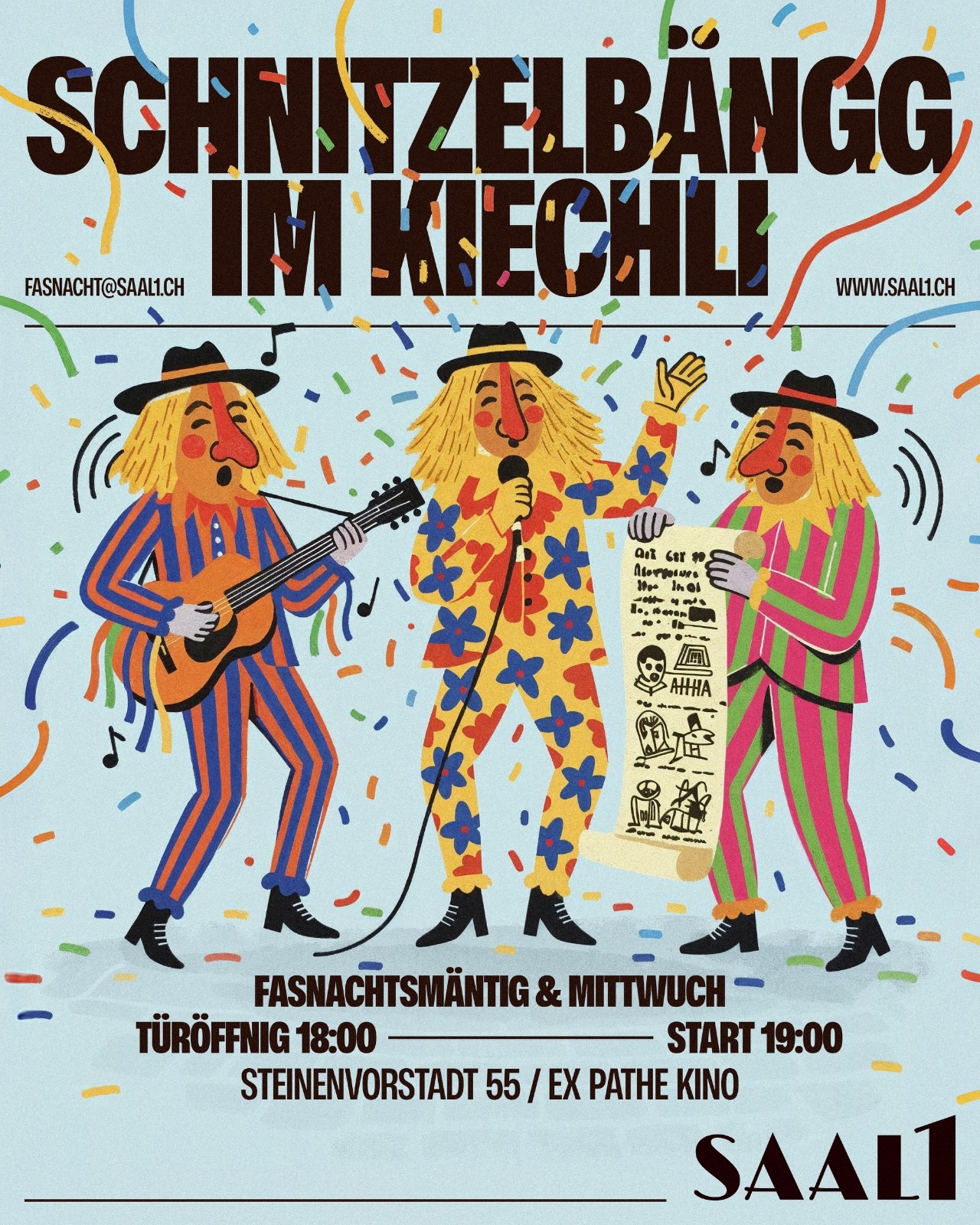 Client work for SAAL1, one of Basel's established event venues. Designed two individual posters for separate events — each needing its own visual identity while staying coherent with the venue's character.